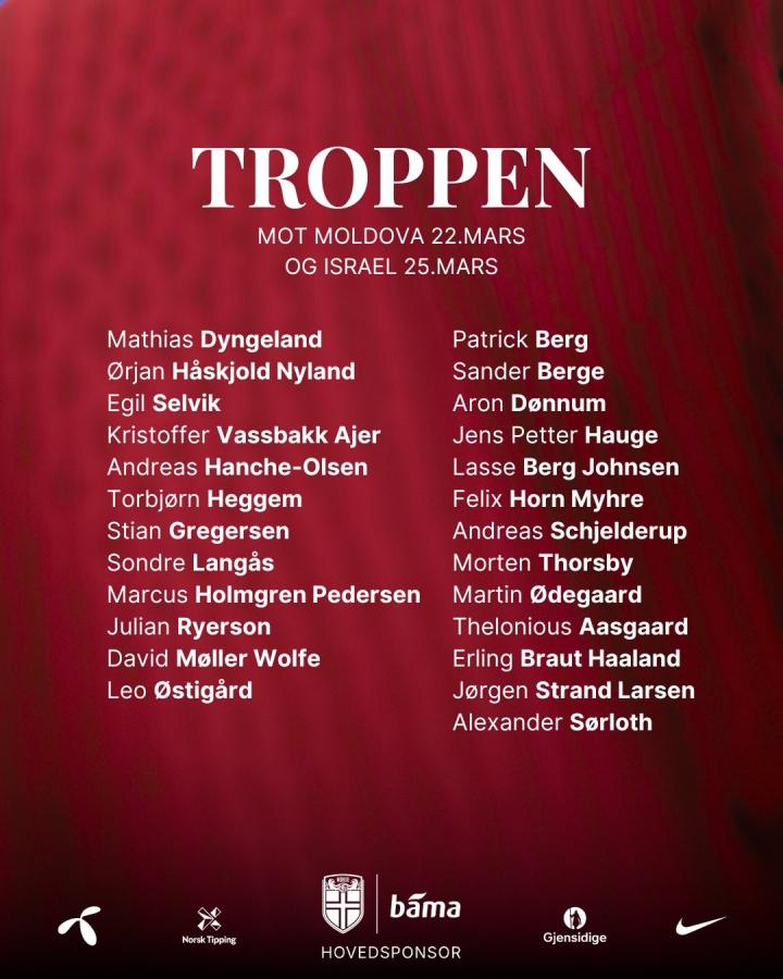 挪威国家队近期发布了新一期的国家队大名单,备战即将到来的世界杯欧洲区预选赛。挪威队此次阵容强大,包括哈兰德、厄德高以及瑟洛特等球员,他们将在3月21日和26日相继对阵摩尔多瓦和以色列。